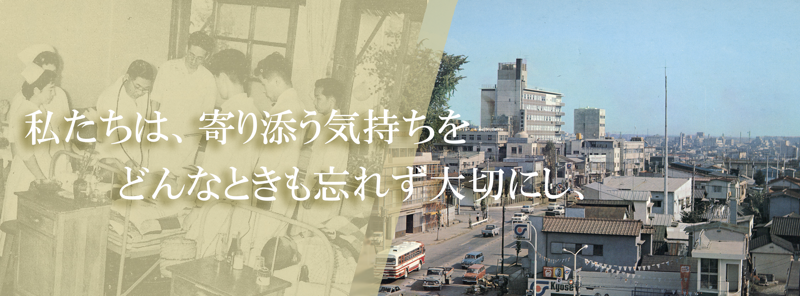 当院は、済生会創立30周年記念式典に際し、時の両陛下からいただいた施設拡充のための御下賜金を基に、昭和17年5月30日、宇都宮市一条町に仮診療所として発足しました。当時の職員は医師2名・看護師3名・庶務3名の計8名でした。昭和19年には曲師町の既設建物を買収し、その名を宇都宮病院と改称して移転するも、翌年、戦災により建物が全焼してしまいます。しかし、「一日も恩賜の医療の灯を消すこと無かれ」と、全職員をあげて昼夜罹災傷病者の無料救済に奮闘しました。