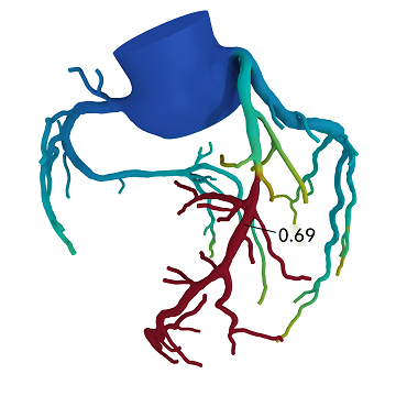 そのためカテーテル検査のような痛みを伴う検査を行うことなく冠動脈の危険度を調べることができるようになりました。この検査では、それぞれの狭くなった部分(狭窄)が心臓の働きにどのように影響するかを患者様個別の冠動脈3Dモデルで解析結果を確認できます。図では左前下行枝と呼ばれる血管が赤で示されていますが、狭くなった部分で実際に血液の流れが滞り、治療が必要である、例えるなら「赤信号」であることを示しています。図に示された数値は本来であれば痛みを伴うカテーテル検査でしか測定できないFFRと呼ばれる値です。0.75-0.80以上であれば治療を要さない狭窄ですが、この図の結果では0.69と低下しており、血液の流れが低下して実際に心臓に悪い影響を与えていることを示しています。