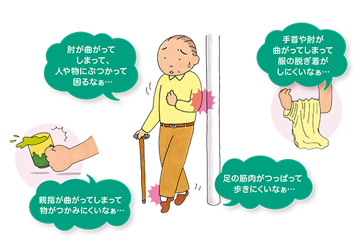 痙縮では、手指が握ったままとなり開こうとしても開きにくい、肘が曲がる、足先が足の裏側のほうに曲がってしまうなどの症状がみられます。