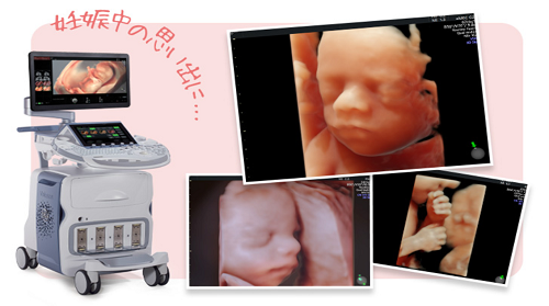 赤ちゃんの映像を立体的にリアルタイムでご覧いただける4Dエコーを導入しています。ご希望の方には、超音波のモニター画面を一緒にご覧いただきながら、お腹の赤ちゃんの様子や動きをわかり易くご説明します。撮影した画像・動画はスマートフォンでダウンロードすることができます。