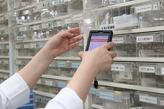 計数調剤はPDA(バーコードリーダー内蔵携帯情報端末)を使用した調剤支援システムを導入、誤調剤を防ぐ取り組みを行っています。現在、院外処方率は約84%であり、入院処方調剤が中心となっています。