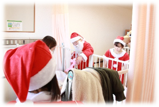 毎年小児科病棟と緩和ケア病棟でクリスマスの日には、サンタクロースに扮した医療栄養科の職員がクリスマスカードとお菓子入りブーツそして、バルーンアートを行い渡しています。