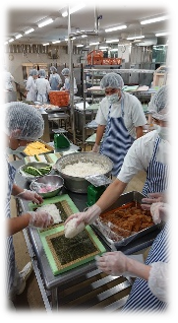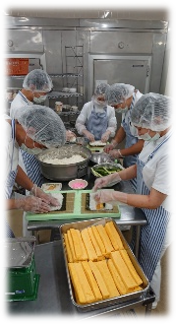 調理業務は、衛生マニュアルに基づき、調理師が、「安心して患者さんに適した食事をおいしく食べていただくために!」をモットーに心をこめて食事を提供しています。