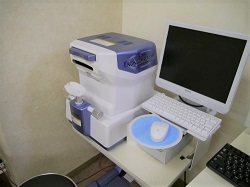 目の長さ(大きさ)を測定します。接触型と非接触型の検査があります。 先ほどお話したように、人はそれぞれ目の大きさが異なります。各々の目の大きさを測定しコンピューターで計算することで、患者さんに最も合う人工のレンズを決定します。当院ではより再現性を高めるために、接触型(超音波Aモード)と非接触型(IOLマスター)の両方で測定しています。