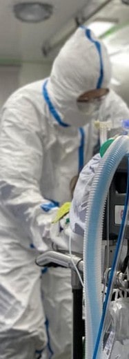心電図や酸素飽和度などを表示するモニターや、呼吸の代わりをする人工呼吸器、心臓や肺の役目を行う経皮的人工心肺装置(ECMO)など集中治療室では様々な医療機器が使用されています。