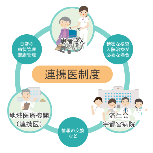 連携医制度の目的は、済生会宇都宮病院と連携医(かかりつけ医)が、それぞれの特徴を生かして、地域全体で患者さんの健康管理を行おうというものです。